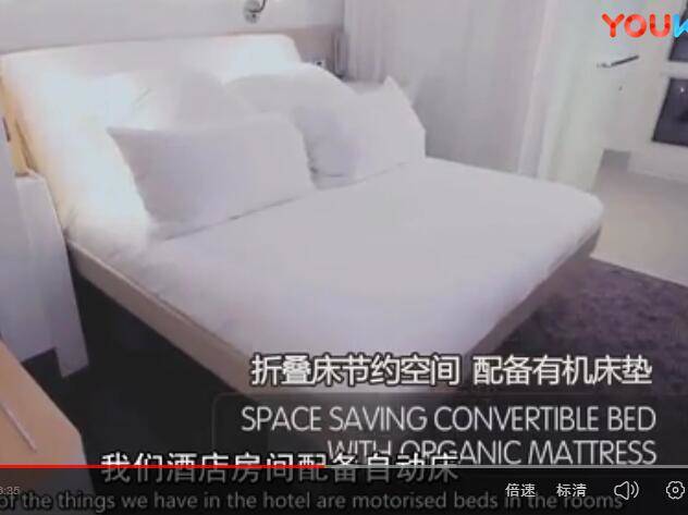 然後是觸控屏訂房系統,和麥當勞點餐系統一樣,消滅前台用的。接下來是自動伸縮摺疊牀,沙發和牀二合一,節約空間用的,感覺是針對沒錢租太大房子的人的?但同樣但不上自動化。