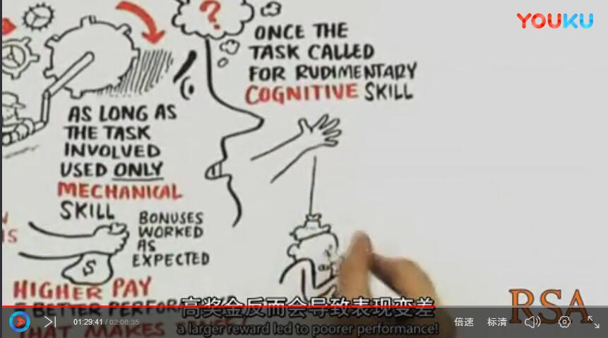 然後按完成的成績給予不同的獎金,且越靠後的幾輪實驗給的獎金越多。實驗結果是,越是簡單機械的任務(刷馬桶?),獎金給得越多學生們就完成得越好;越是需要認知能力的任務,獎金給多了學生們反而完成得越差。
