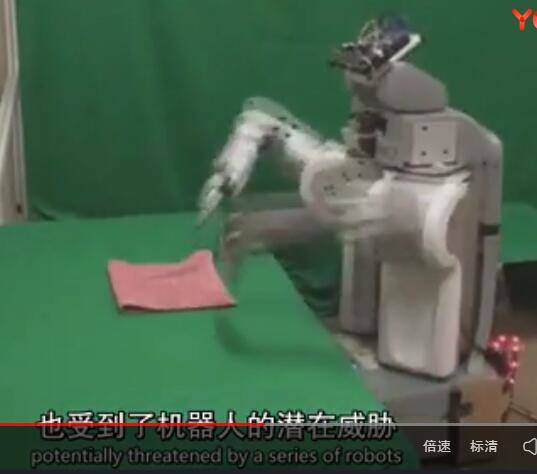 然後是疊衣服和毛巾的機器人,似乎是委託酒店洗好、烘乾的衣服和毛巾會由這個機器人疊好收納?頭頂的望遠鏡應該是攝像頭,猛一看真像天牛成精~~