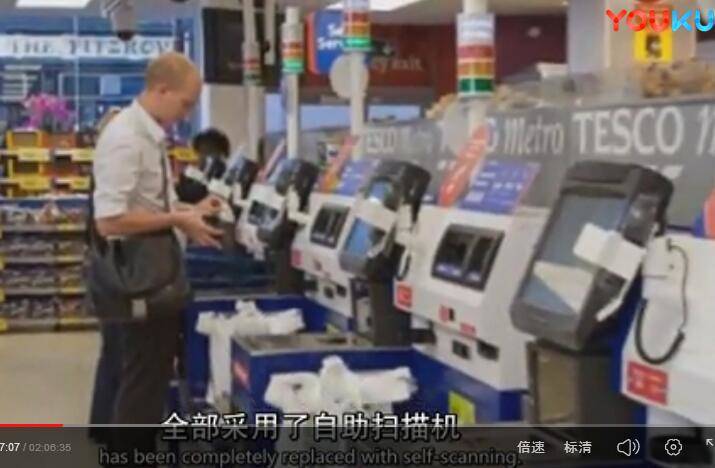 此片是2014年左右翻譯的,其實北京物美超市去年也有這類東西了,但1、2代都沒有傳送帶,是讓顧客自己拿着商品往掃描器或用裝了特殊app的智能手機攝像頭掃,然後在一個員工的輔助下,最後拿支付寶或微信掃二維碼結賬的。