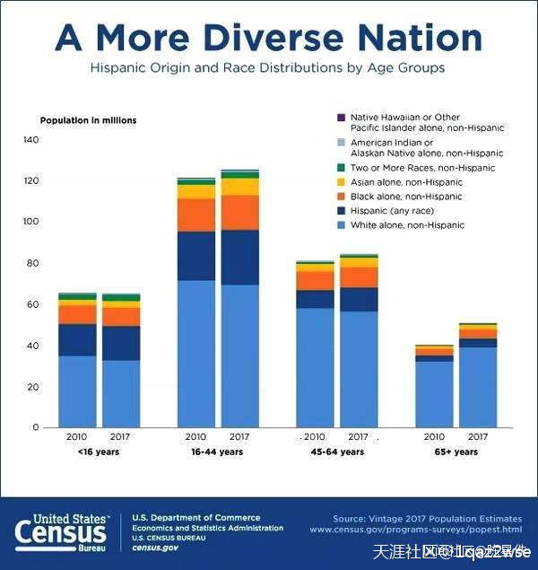 與此同時,據美國人口普查局21日發佈的最新數據顯示,美國人口的種族結構進一步變得多樣化,加之老齡化加劇,非西班牙裔白人是2016年至2017年唯一一個人口出現下降的羣體。