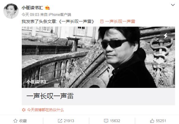 崔永元微博小號@小崔讀書匯 今早更新微博,《一聲長嘆一聲雷》。目前閲讀已達900萬+。