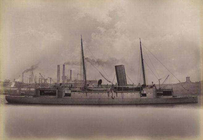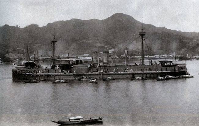 中日甲午戰爭中,“鎮遠”號鐵甲艦被日軍俘獲,這張照片正是攝於其被俘後日軍檢修之時: