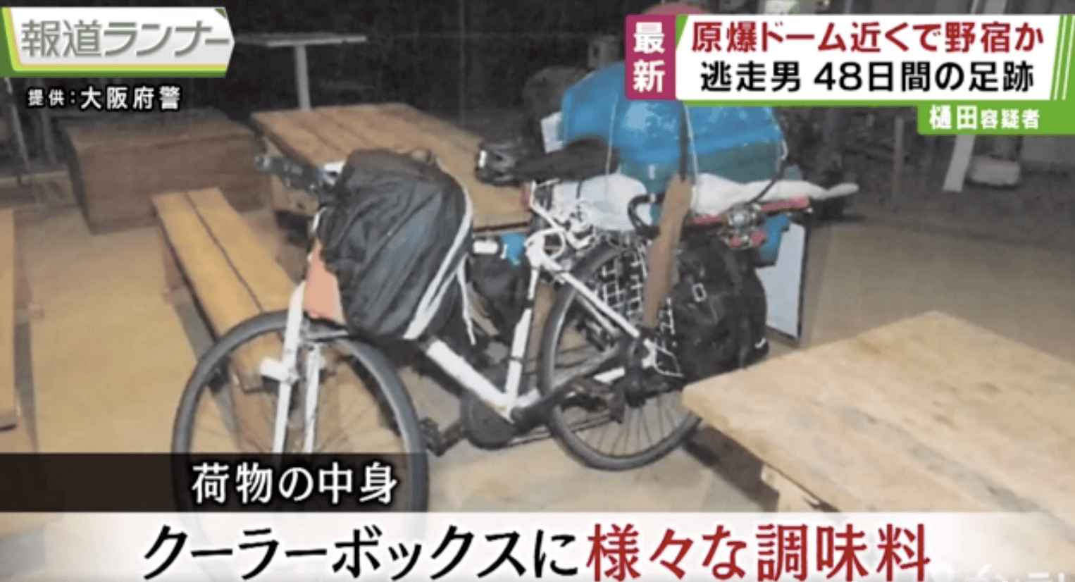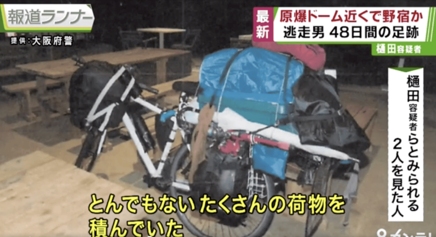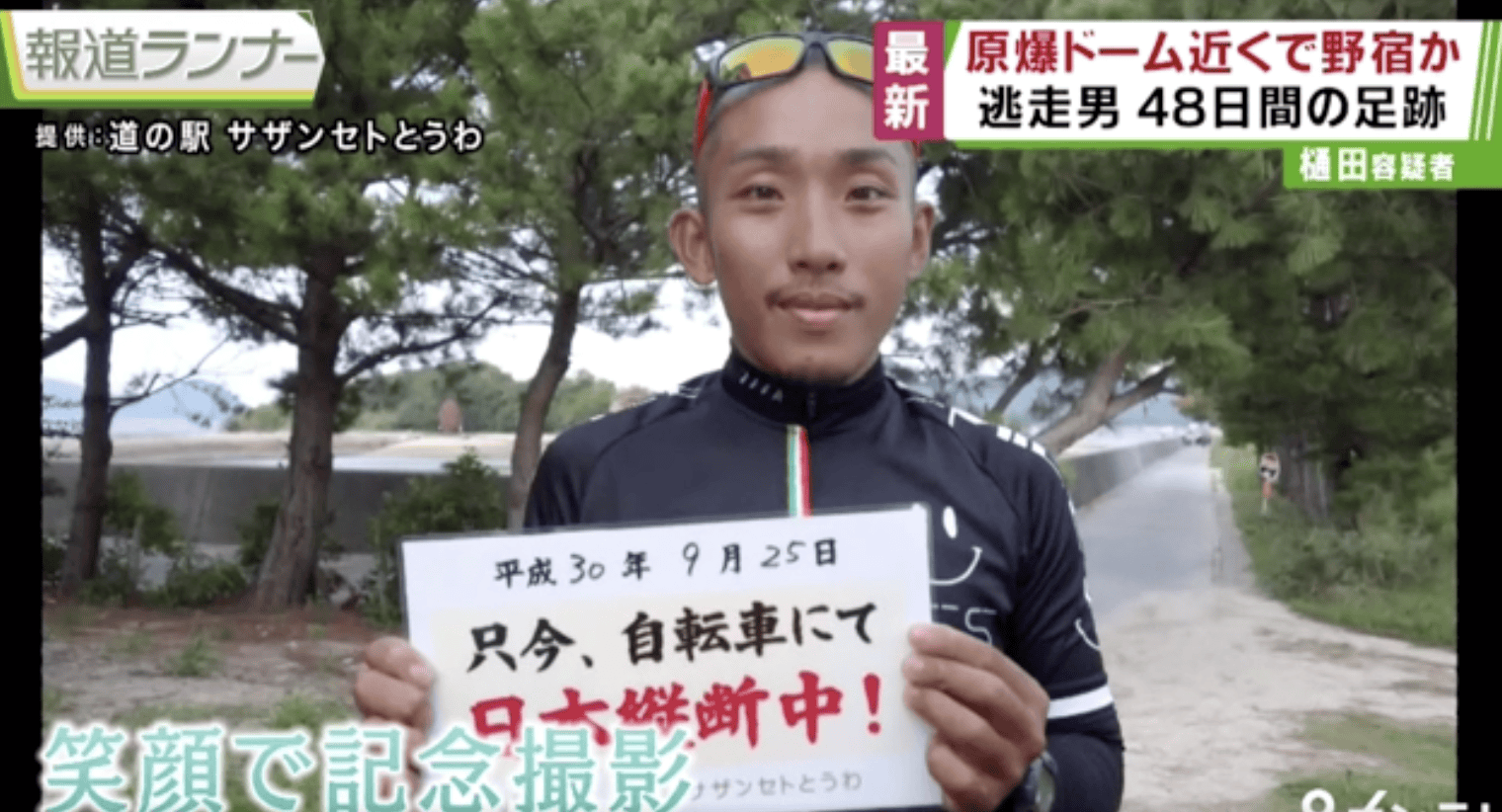在便利店將便當藏進大衣裏,這個畫面被便利店的防盜監控錄像拍下後,今年30歲的樋田淳也作為嫌疑犯被日本大阪警方逮捕。8月12日晚,在大阪市富田林警察署的會面室等待警方做口錄的他,在無人看管時打破了玻璃奪窗而逃,之後偽裝成環遊日本一週的騎行愛好者,在9月29日被抓到之前逃亡了足足49天,行程超過了1000公里。更令人瞠目結舌的是,逃亡期間的樋田還走訪了各大著名風景區拍照留念,到處蹭吃蹭喝還泡了温泉,一副十分享受的樣子。
