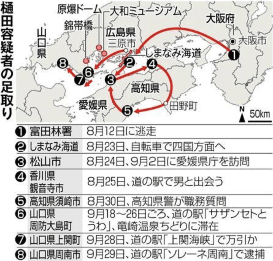 就在大阪的警察加班加點搜查之後,8月14日開始不斷有新的消息傳來,然而傳來的消息令人詫異。最早的消息是8月23日,樋田穿過廣島縣的一個名叫“島波海道”的觀光景點,之後來到了愛媛縣境內。島波海島是廣島著名景點,也是騎行愛好者最喜歡去的地方。