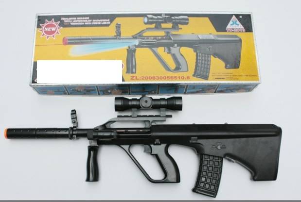 下圖是把聲光玩具槍,完全不能發射的AUG,做工粗糙,但是真槍的外形畢竟還是有市場的…廠家也是有心,把聲光槍做的相對真實。