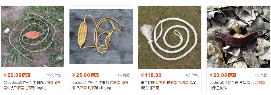 這也買得到,還很便宜。你要有大衞的力量和技巧,利用離心力甩出石頭去,格利亞你大概也能打個半死,弓箭可以説是運動器械,可投石索幾乎是單純的武器,禁止?這東西更沒法禁,畢竟繩子加布就能做,撿塊石頭就能幹仗,比如巴勒斯坦人用來對付以軍…
