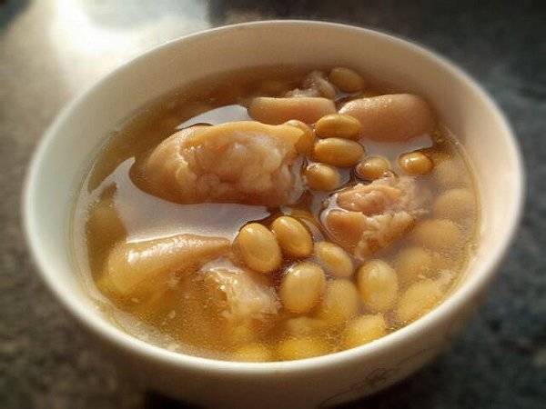 豬蹄2個、黃豆100克、葱姜25克,鹽、香油適量;用温水將黃豆泡開;豬蹄洗淨剁塊,焯水後備用。砂鍋內放適量的水,將葱、姜、鹽、香油放入,水開後下黃豆、豬蹄塊,大火燒開後以小火燉爛蹄肉和黃豆。