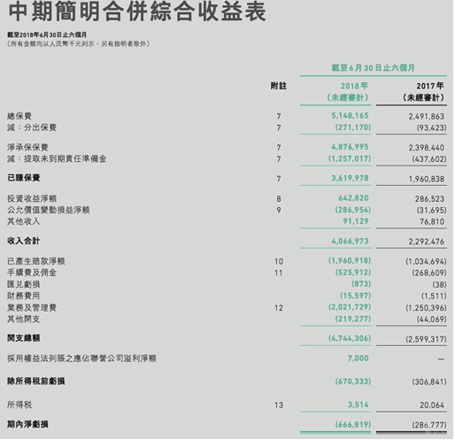 根據眾安保險的2018年上半年財報來看:2018年上半年眾安共實現總保費收入人民幣51.482億元,同比增長106.6%。雖説保費收入是同比增加,但它淨利潤的虧損高達6.67億元,虧損的額度持續擴大。同時這也是它上市後才出現的虧損局面,2014—2016年眾安保險還是盈利的,淨利潤分別為0.37億元、0.44億元、0.09億元。