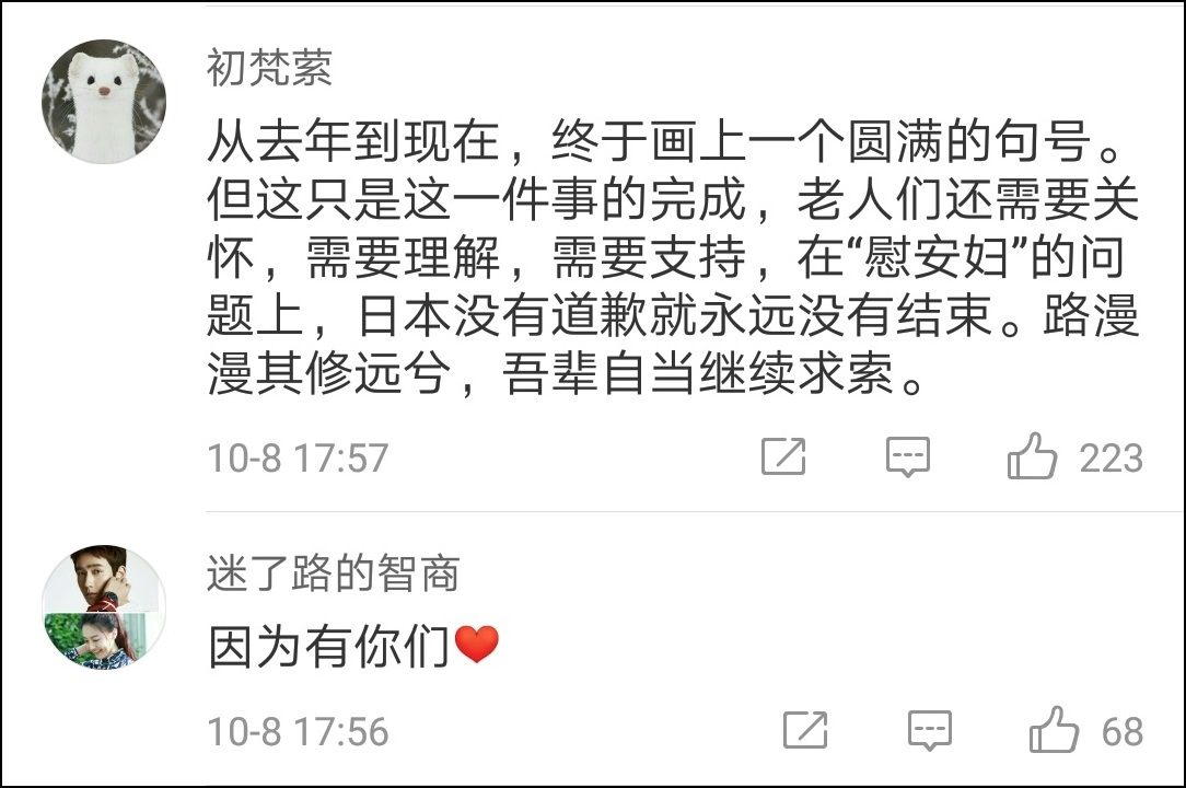 在這份捐款説明中,影片資助人張歆藝、導演郭柯等四個捐贈方聯合説明稱,紀錄片上映後得到了社會各界的無條件支持,又值第一齣品公司收到票房結算尾款,為回饋社會支持,持續資助老人生活、支持此項事業持續發展和相關歷史研究調查,四方共同決定:捐資上海師範大學教育發展基金會,並在上海師範大學教育發展基金會內設立“慰安婦研究與原著”項目專項基金,定名為上海師範大學教育發展基金會“慰安婦研究與原著”項目專項基金,每年4月前向社會公佈專項基金使用細則。