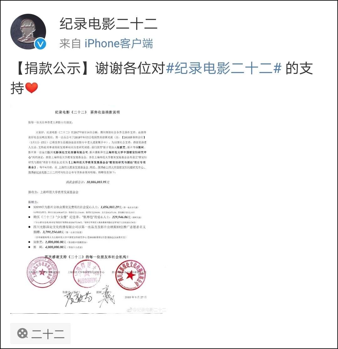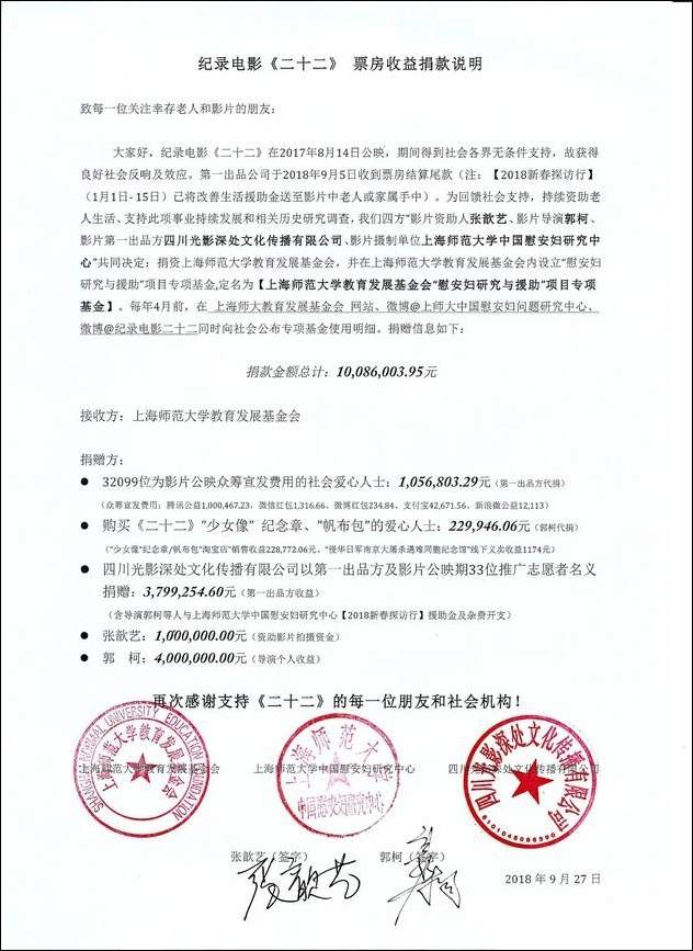 今天下午,已經下映一年多的紀錄片《二十二》通過官方微博發佈一份捐款説明,宣佈影片資助人張歆藝、導演郭柯、出品方四川光影深處文化傳播有限公司、攝製單位上海師範大學中國慰安婦研究中心共同決定向上海師範大學教育發展基金會捐資10086003.95元,並在基金會內設立“慰安婦研究與援助”項目專項基金。
