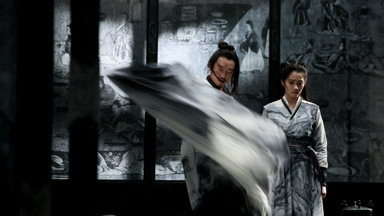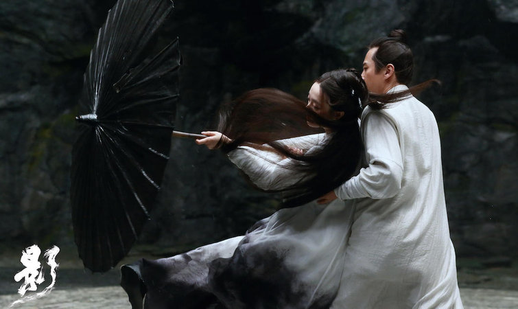 既然叫《影》,整部電影倒像極《英雄》的影子,無論是熟悉的雨中決鬥,灰得像哭過的天空,還是衣袂飄飄光影繚亂的景緻。整個故事也是一個刺殺與訓練殺手的故事,捎帶着大軍壓境攻城。但這次顯然是預算壓縮了,從秦軍氣吞萬里如虎的“虎!虎!虎!”變成了一堆人肉坦克撐着鋼片傘在江南的雨巷裏如龜般飛馳而過。而且我覺得導演對“軌跡”似乎很感興趣,《影》中出現了與《英雄》幾乎一致的拖刀踏水鏡頭,武器劃過水面濺起水花,再不就是《英雄》裏梁朝偉在沙盤上畫趙字。聯想到北京奧運會開幕式上導演要找兩個人蘸滿墨在宣紙上滾來滾去,以及平昌冬奧會上“北京八分鐘”讓熊貓穿旱冰鞋在地上畫光影軌跡,這個符號似乎確實是導演的心頭好沒錯了。