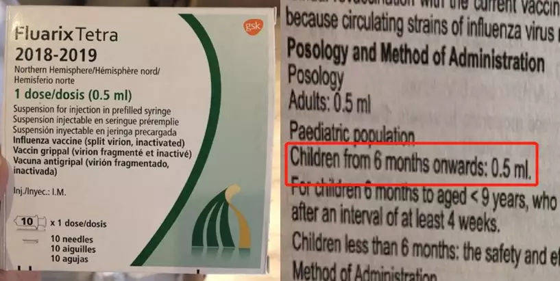 上圖是史克公司供港的流感4價疫苗包裝盒及説明書,其説明書裏明確寫到:成人劑量0.5mL,≥6月齡兒童也是0.5mL。