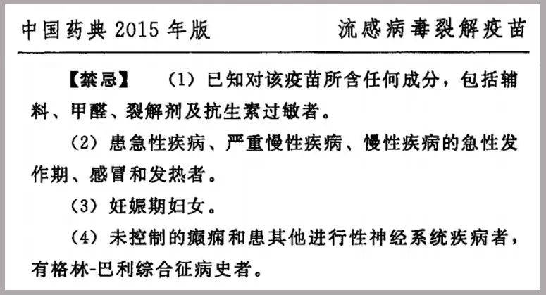 提示:前面出示的2015版藥典流感疫苗説明書中,孕婦禁忌接種。