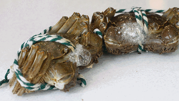 其次,分辨“螃蟹腿”也可以進行區分,一般母蟹僅有兩螯上灰黑色的一團絨毛,蟹腿的其他部位非常乾淨,而公蟹的八隻腿上還會有排列成刷子一樣的細毛。