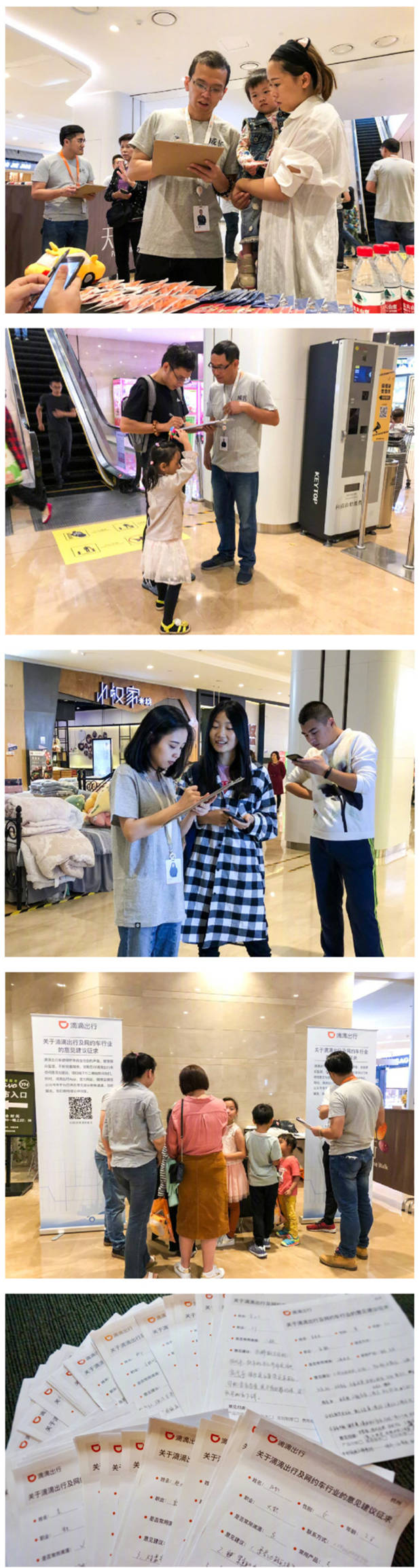 為了提升用户體驗、提高安全體系的建設能力,並進一步宣導安全產品功能,國慶長假期間,滴滴在北京杭州等城市開展了線下用户調研和意見徵集活動。 10 月 7 日,在北京華潤五彩城購物中心,滴滴出行 CEO 程維和總裁柳青帶領管理團隊上街,面對面與用户交流,深入瞭解用户體驗和訴求,認真傾聽用户在安全產品、客服改進等方面的批評和意見。