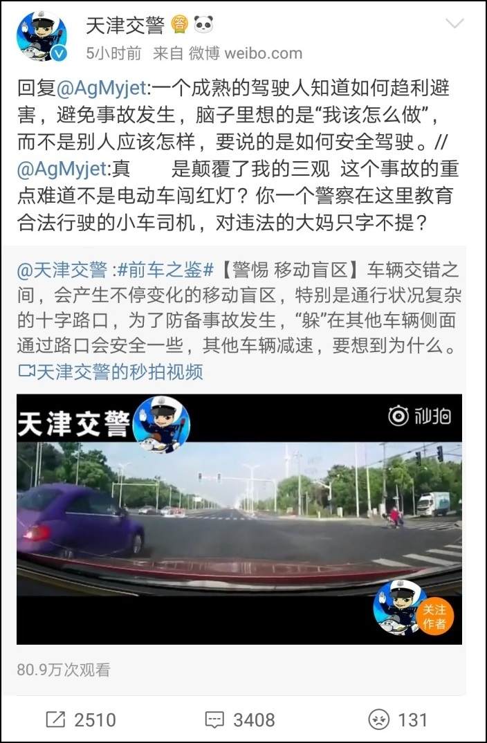 但是,@天津交警 卻振振有詞地回覆説,“一個成熟的駕駛人知道如何趨利避害,避免事故發生,腦子裏想的是‘我該怎麼做’,而不是別人應該怎樣,要説的是如何安全駕駛。”