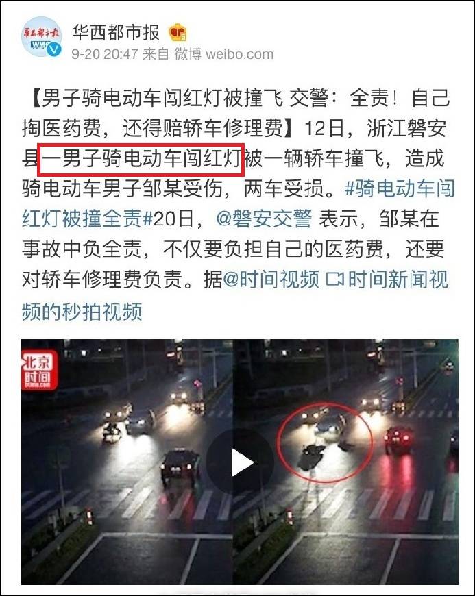 最近發生的案例是在上個月的12日,浙江磐安縣發生的一起交通事故。一男子騎着電動車闖紅燈被一輛私家車撞飛,造成電動車男子鄒某受傷,兩車受損。磐安交警表示,鄒某在事故中負全責,不僅要負擔自己的醫藥費,還要對私家車的修理費負責。