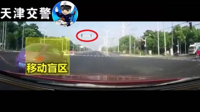 事發時,十字路口上的交通指示燈顯示為綠色,一輛紅色車輛正常行駛;旁邊車道的紫色車輛速度較快,行駛在紅色車輛的左前方,由此形成官微口中的“移動盲區”;