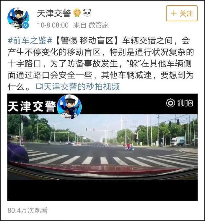 事情起於早上8時許,@天津交警 發佈的一則微博,提醒私家車車主警惕移動盲區: