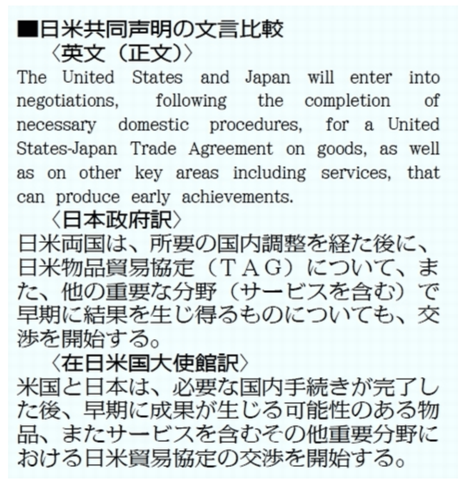與此相對的,日本政府發表的日文版“日美共同宣言”中,直接將小寫的“on goods”納入到了合同正式名稱中,因此捏造出了“日美物品貿易協定(TAG)”的存在,並稱是雙方簽訂的就是TAG,以此來愚弄國民和欺騙TPP的其他成員國。就這一點,《赤旗新聞》也指出,美國駐日本大使館的正式日文翻譯中,所説的是“美國和日本在完成必要的國內相關流程後,將就較早能夠有可能產生成果的大宗商品以及服務業等一些重要領域開始日美貿易協定的磋商”,明確説的是雙邊貿易協定(FTA),而不是TAG。