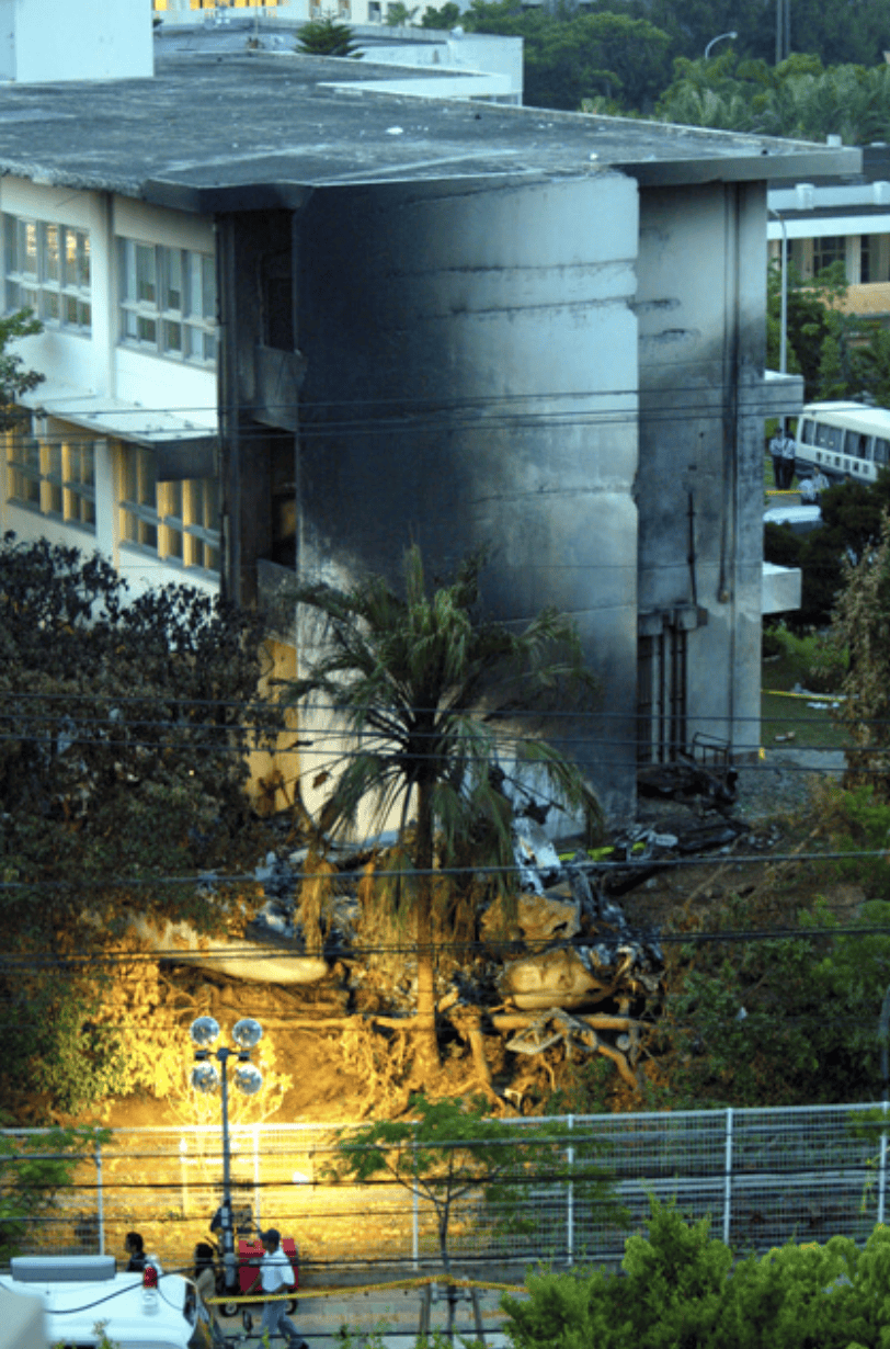 2004年8月,一架隸屬於普天間基地的美軍CH-53D大型運輸號直升機在練習時發生事故,直接墜落在沖繩國際大學的一號館北側,損壞了圖書館的一部分牆壁後砸在教職員室上方,4人重傷20多人輕傷。更令當地人憤怒的是,在墜落事件發生後,美軍迅速佔領了沖繩國際大學並拉起警戒線,強制驅散當地學生並將周圍土壤挖走,不允許日本方面的消防隊員和警察介入。事故發生後,當地掀起了8萬多人的大規模抗議活動,使得美軍基地問題上升到白熱化的程度。
