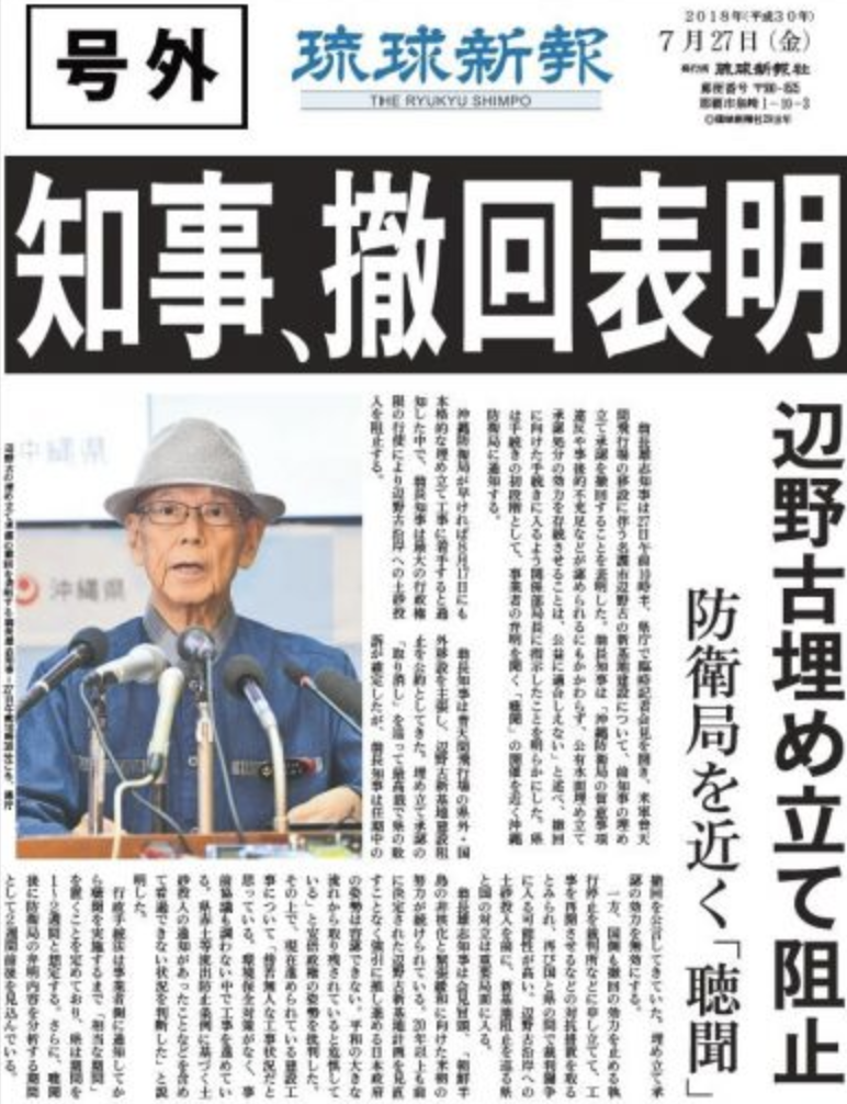 因為癌症接受化療而掉光頭髮的翁長雄志仍然頑強地撤回了邊野古建設基地的決定