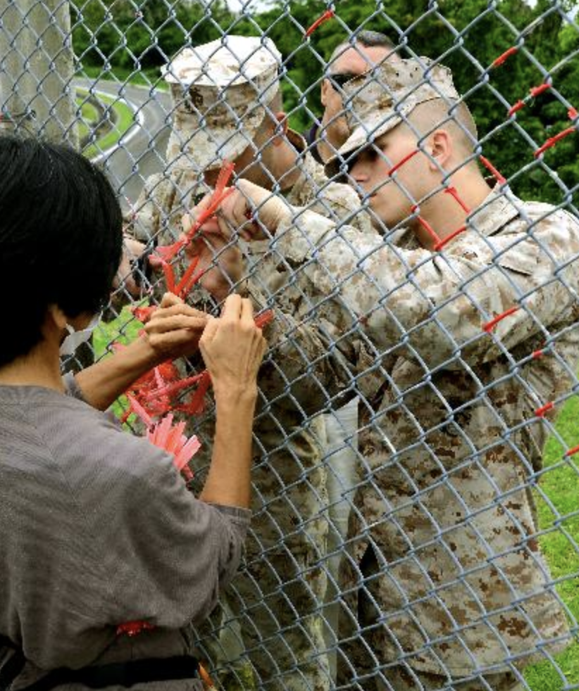 現在在普天間美軍基地外,經常會有日本本州而來的軍迷們一邊開心地拍着基地內轟鳴的魚鷹直升機,一邊拉開橫幅高喊支持美軍駐留的口號。與他們相反的一側,就是抗議美軍基地駐留的抗議團體。從抗議團體中走出來一名老人這樣告誡着支持美軍的年輕人們:“沖繩戰役知道嗎?多讀點書吧。”