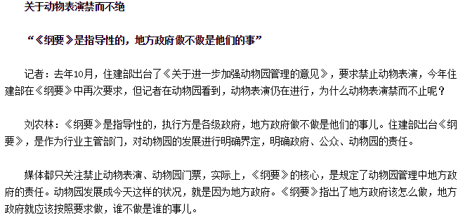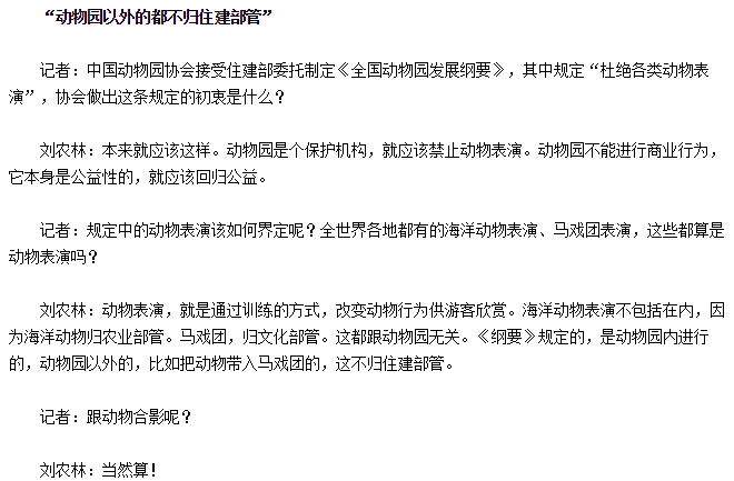 據北京青年報報道,《綱要》起草人之一、中國動物園協會總工程師劉農林在解釋受約束的動物表演類型時説,“**海洋動物表演不包括在內,因為海洋動物歸農業部管。**這都跟動物園無關。《綱要》規定的,是動物園內進行的,動物園以外的,比如把動物帶入馬戲團的,這不歸住建部管。”
