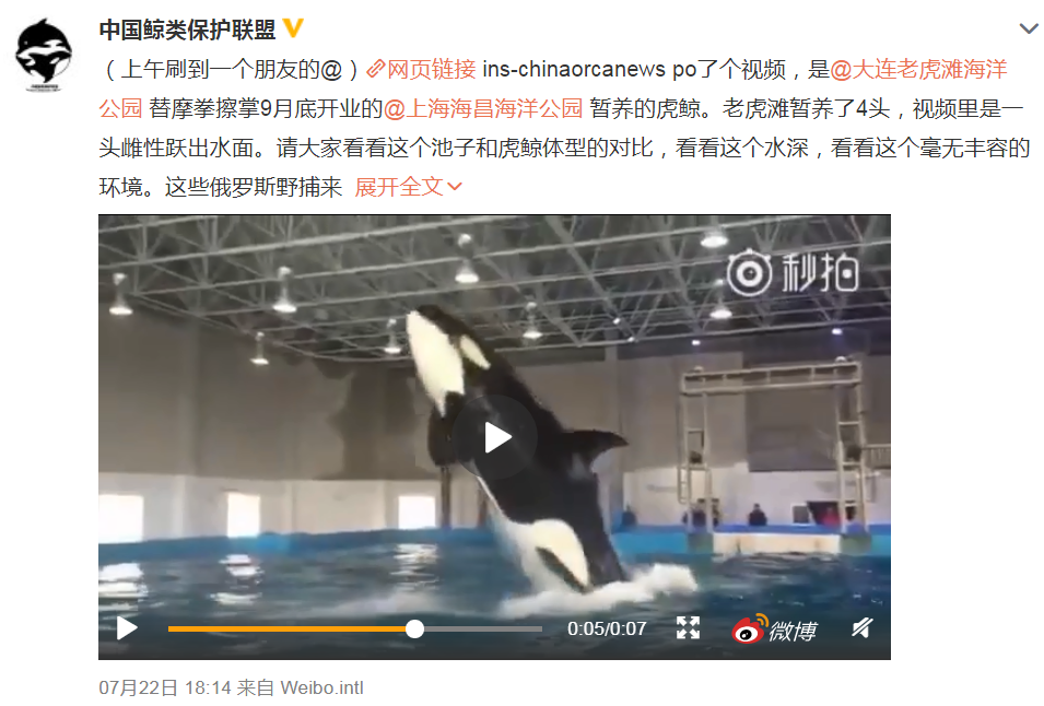 7月底@中國鯨類保護聯盟 也放出一段視頻表示這是上海海昌海洋公園暫養在大連老虎灘海洋公園的虎鯨。