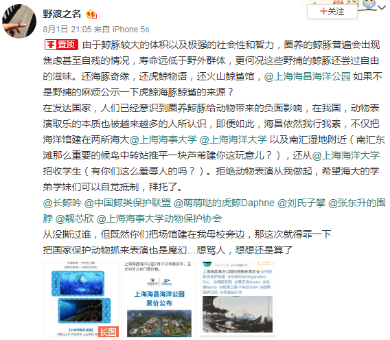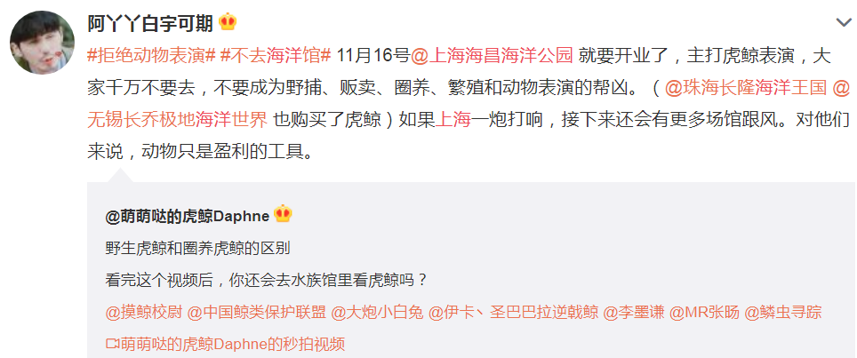 國慶期間,上海海昌海洋公園開園試運行,本來是要徵集遊客意見方便改進,但是網友的意見卻是拒絕虎鯨表演。