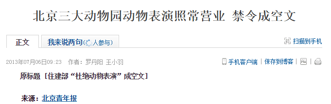 據浙江在線報道,2010年7月國家林業局就下發了《進一步規範野生動物觀賞展演行為》的通知,要求立即停止野生動物與觀眾零距離接觸、虐待性表演;同年10月,住建部發布了《關於進一步加強動物園管理的意見》,要求各地動物園和公園立即停止所有動物表演項目。2013年7月,住建部又發佈《全國動物園發展綱要》,其中明確提出要在動物園杜絕各類動物表演。