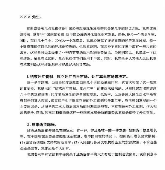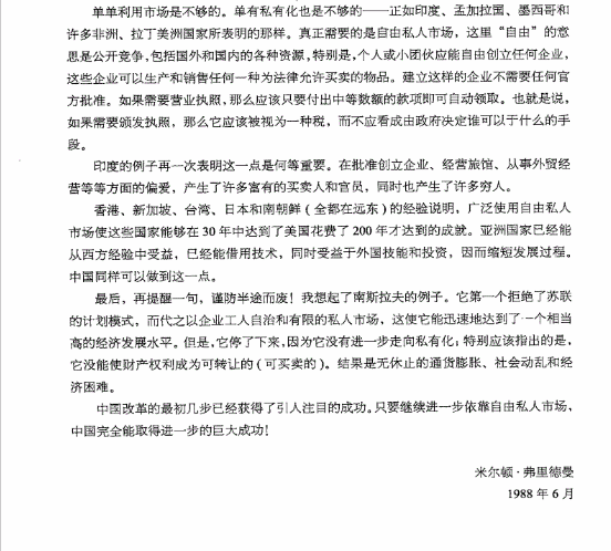 第二次中國行的高潮是在北京,弗裏德曼與趙的會面。有關此方面的過程,在本系列文《中國經濟奇蹟密碼——混合經濟(一)》裏,張五常的書裏,已經有過介紹,也列出了弗裏德曼意見的四點主要內容,此處不再贅言,只將其意見全文如下: