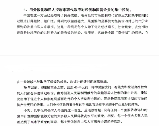 江口中的社會主義市場經濟,顯然與弗裏德曼五年前獻寶趙的四點建議有一個很大的區別,在上述呈現的截圖裏,第四點弗裏德曼建議“用分散化和私人控制來取代政府對經濟和國有企業的控制”完全是不同的概念。