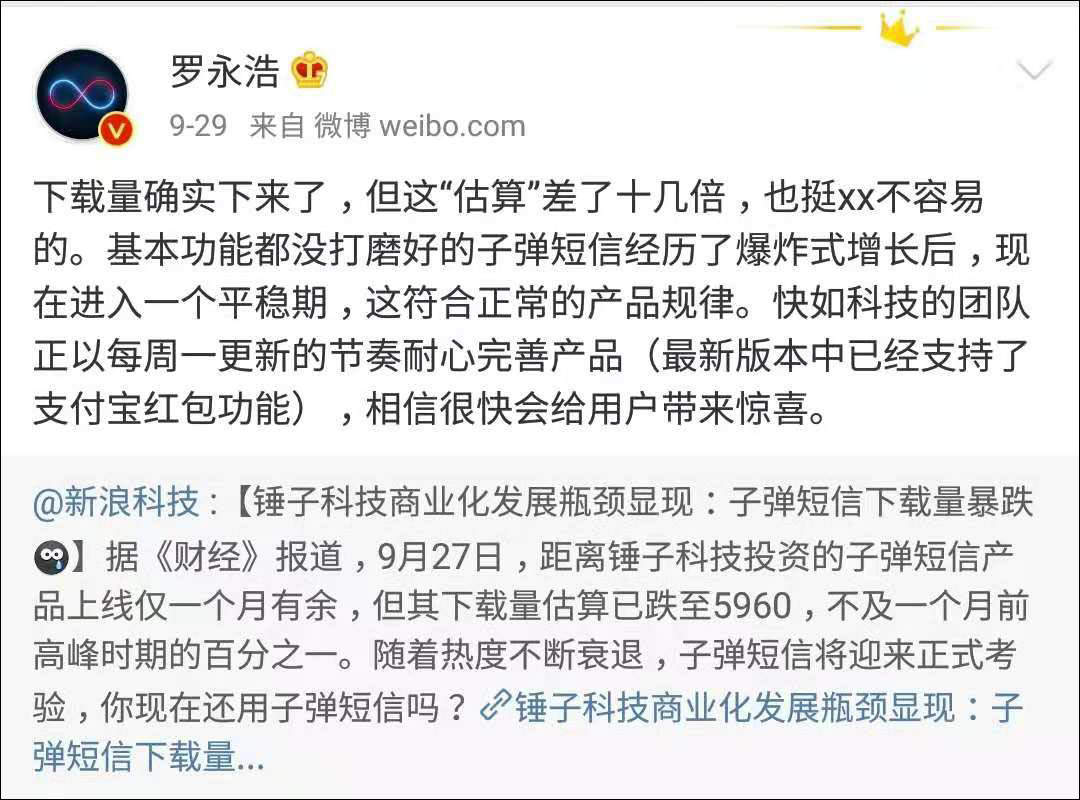 對於下載量下降這一事情,老羅在自己微博中回應稱,下載量確實下來了,但是“估算”差了十幾倍。子彈短信現在進入了一個平穩期,這是符合正常產品規律的。另外羅永浩還在微博痛斥某些媒體的造謠和誇大報道。