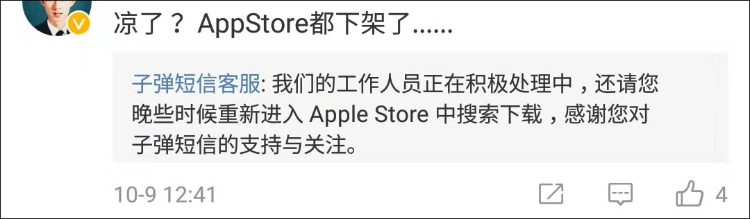 子彈短信下架後,有網友在子彈短信微博下面詢問,客服回應説“Apple Store中無法搜索下載子彈短信的問題我們的工作人員正在積極處理中,還請您晚些時候重新進Apple Store中搜索下載,感謝您對子彈短信的支持與關注。”