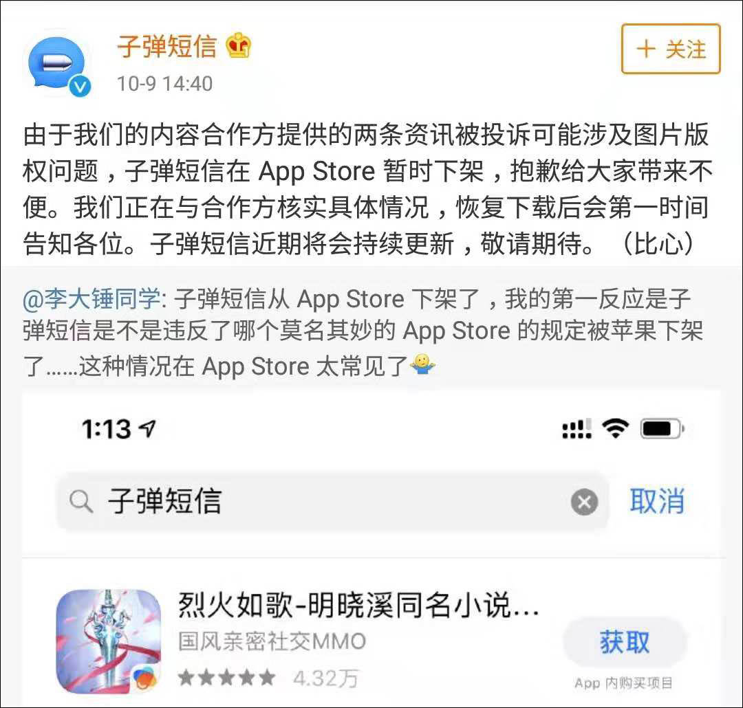 子彈短信在回應中稱,是由於內容合作方提供的兩條資訊被投訴可能涉及圖片版權問題。