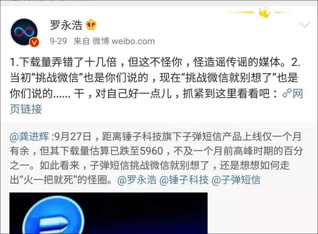 子彈短信和騰訊的糾葛還不止這一個。在之前我的一篇文章中寫過,錘子科技9月份舉辦了一場主題為《讓子彈飛一會兒》的直播,錘子科技CEO羅永浩在直播中表示,子彈短信上線的第二天早晨,騰訊投資部就打過來電話,説要跟子彈短信的團隊聊一聊投資的情況。然而,後來騰訊方面回應並不存在這樣的情況,直接打了羅永浩的臉。