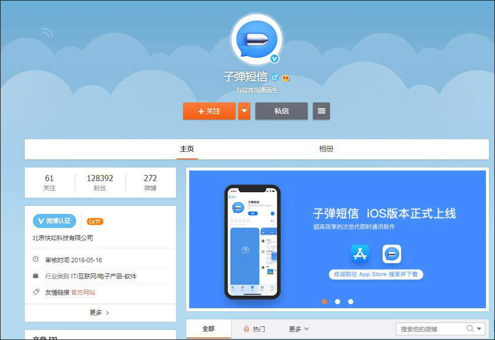 在子彈短信的官方微博首頁上,子彈短信IOS版本正式上線的slide還在十分顯眼的位置。