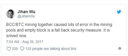 “BCC/BTC聯合開採在開採池中造成了大量的誤差,而空區塊是一種安全措施倒退的表現。現在問題解決了。”