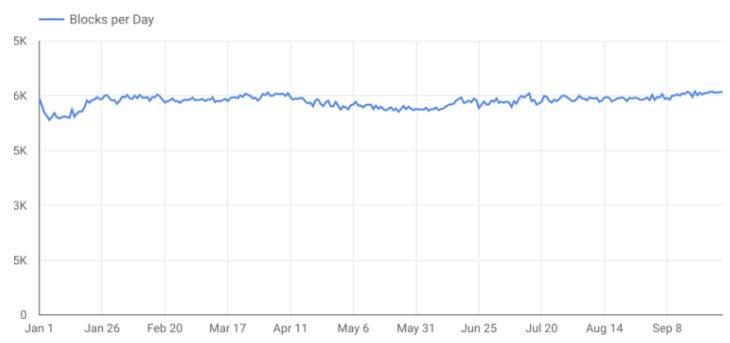 然而,到目前為止,還沒有跡象表明包含未確認交易的mempool與空區塊的增長同步。此外,沒有確鑿證據表明空區塊正在損害以太坊網絡性能。每天大約有6000個區塊被挖出,如下圖所示: