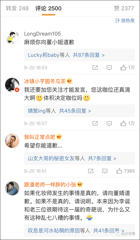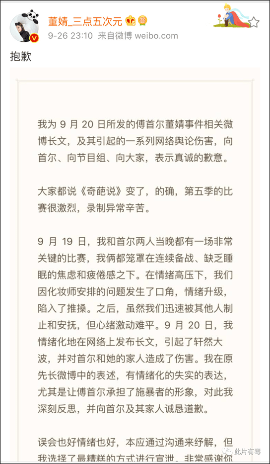 9.26,董婧又在微博發了自己的道歉聲明,稱之前的宣泄行為過激。
