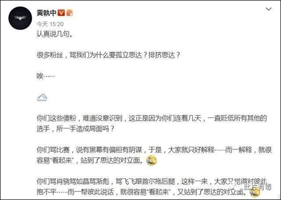 緊接着,邱晨、黃執中也發了讓人一言難盡的微博。