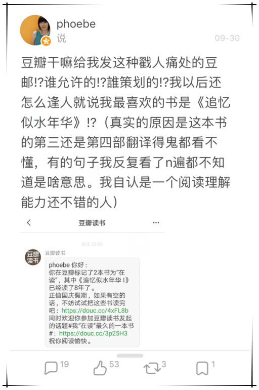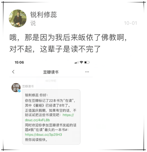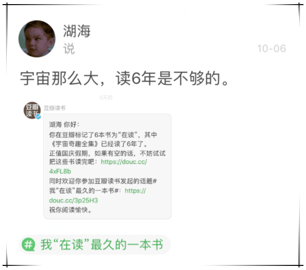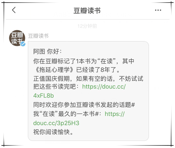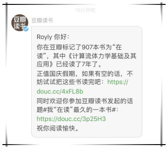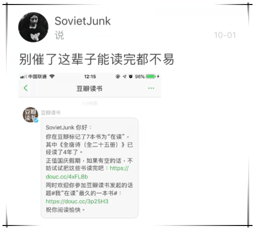 這個國慶節,不少玩豆瓣的朋友都收到了來自豆瓣讀書的消息,讓大家在歡度國慶的時候知道自己還有許許多多的書籍仍是“未讀”。(ps:在讀是豆瓣的一個標記功能,代表着你正在讀這本書,開始閲讀但未結束)