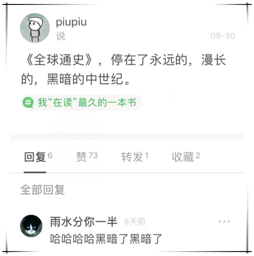 黑暗而漫長的中世紀是全書的第三編,全書一共八編。也許@piupiu的閲讀心路歷程就和中世紀一樣漫長,看不到盡頭,給不了希望。