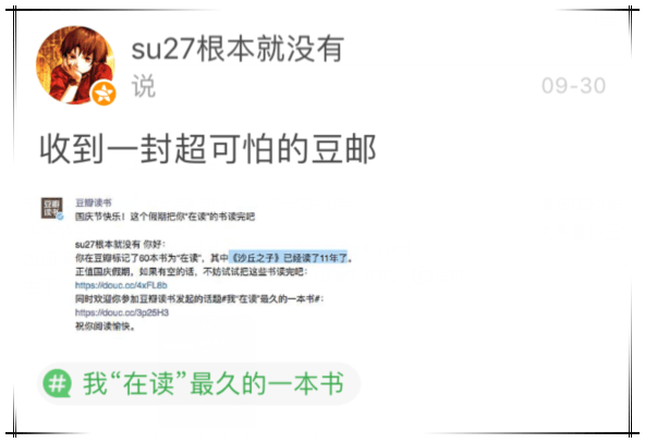 60本在讀,其中《沙丘之子》讀了11年還沒有讀完。豆瓣你想讓我們怎麼辦?國慶假期讀完這60本書,你就會獲得一個充實的七天長假?我們為什麼讀不完,你難道不能自己反省一下嗎?