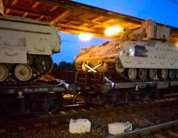 “佈雷德利”如果不進行全面重新設計,繼續在炮塔上增加設備,就會變成……圖為去年美軍參加德國軍演的時候M2A3炮塔頂部新安裝的光電頭被火車站台撞掉……