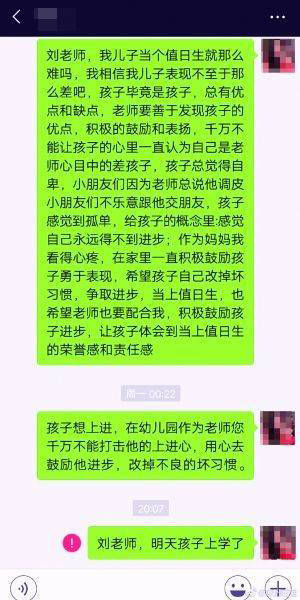 從圖片上可以看到,9月30日深夜11點左右、10月1日零點左右,這名家長給劉老師發了兩條消息,大意是要求老師安排自己的兒子當班上的值日生。“劉老師,我兒子當個值日生就這麼難嗎,我相信我兒子表現不至於那麼差吧……希望老師也要配合我,積極鼓勵孩子進步,讓孩子體會到當上值日生的榮譽感和責任感。”“孩子想上進,在幼兒園作為老師您千萬不能打擊他的上進心,用心去鼓勵他進步,改掉不良的壞習慣。”