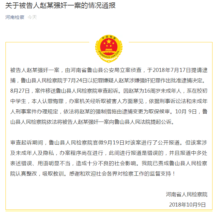 審查起訴期間,魯山縣人民檢察院官微9月19日對該案進行了公開報道。但該案涉及未成年人及隱私,辦案程序尚在進行,此間進行報道是錯誤的,並且報道中多處表述錯誤、用語明顯不當,造成十分不良的社會影響。我院已責成魯山縣人民檢察院認真整改,吸取教訓。感謝和歡迎社會各界對檢察工作的監督支持!