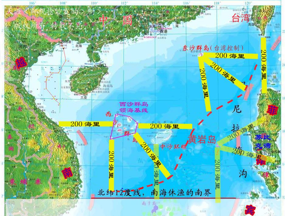 有鑑於此,現在能做的就是根據北部那幾個島,劃出有可能的專屬經濟區的最南端。這條線就是“北緯12度線”,這條線離西沙220海里,離中沙206海里,離黃巖島186海里。用來做勢力線再合適不過了。